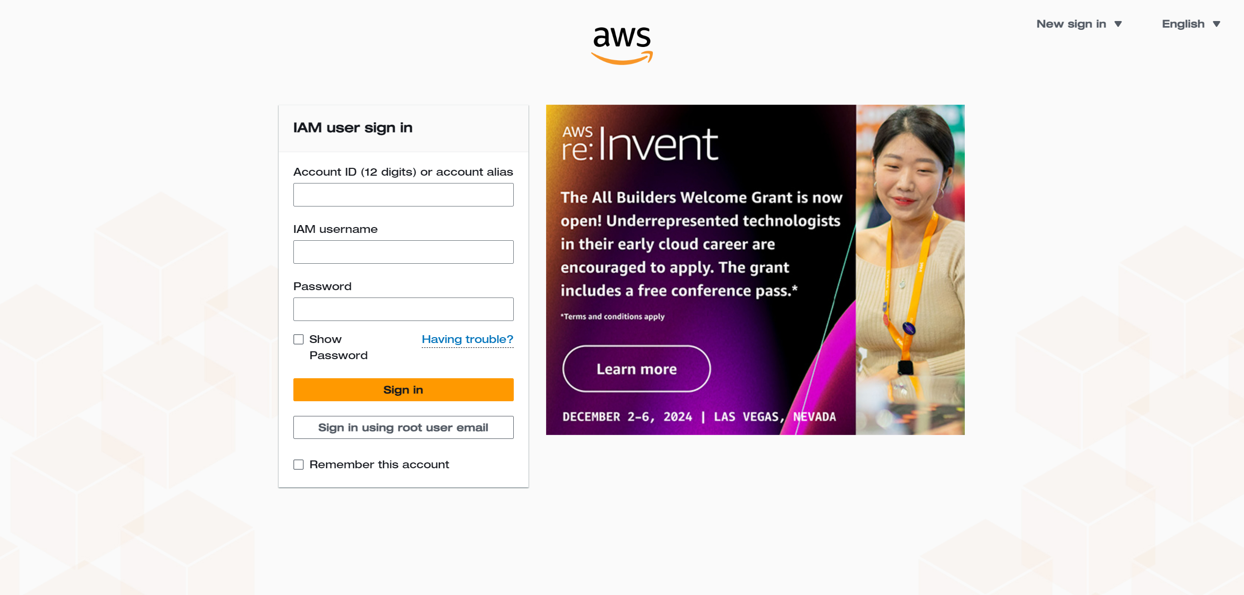 <figure><img src="https://content.gitbook.com/content/J83X2F5b0ahZHQq2DJVj/blobs/iFi8qp0Twugz6JpMv372/aws-login.jpg" alt=""><figcaption></figcaption></figure>