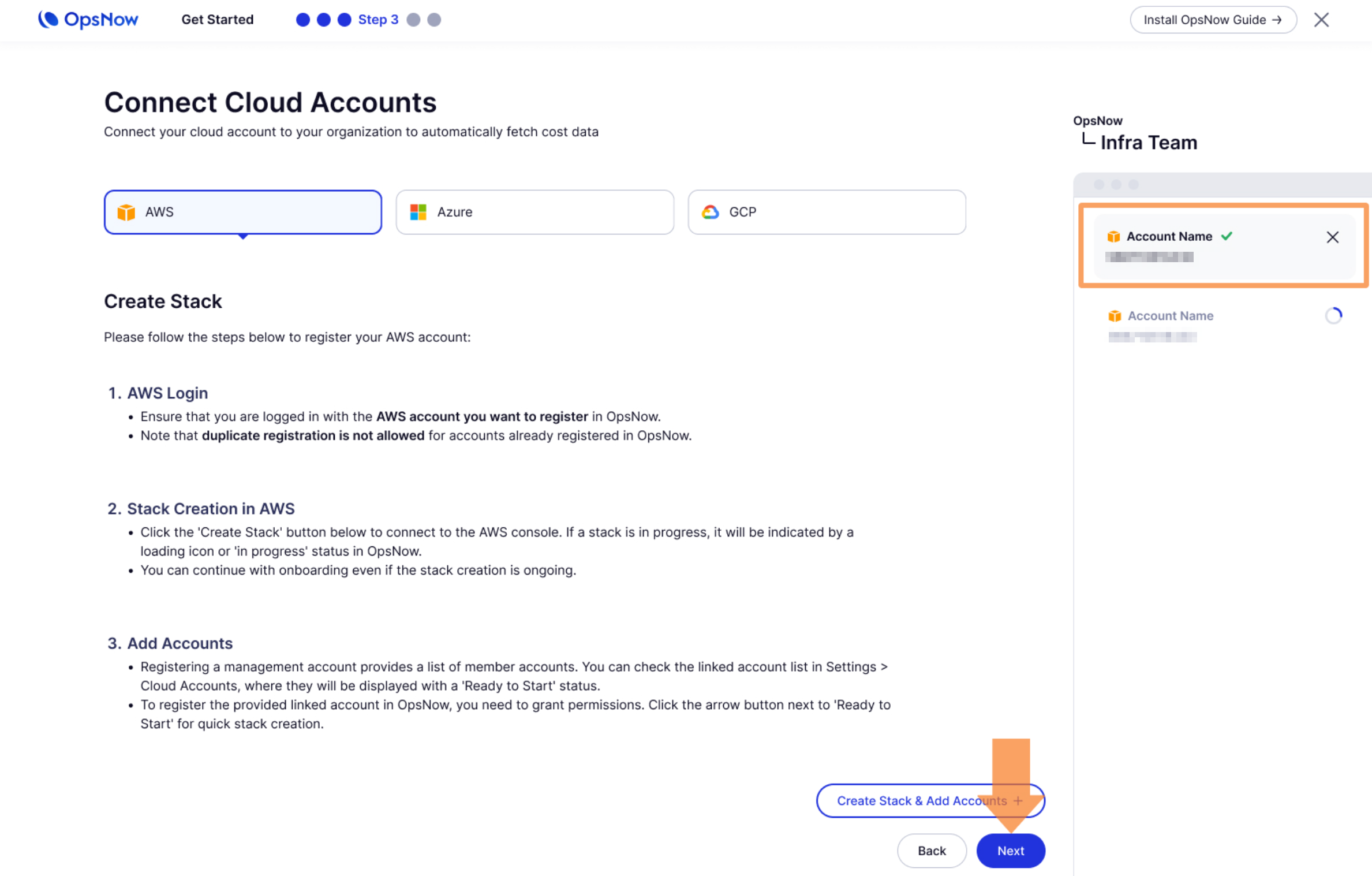 OpsNowにAWSアカウントを接続するには、ウェブページ上の手順に従って操作を行ってください。まず、AWSアカウントにログインし、AWSで [create a stack](https://docs.opsnow.io/dev-opsnow-user-guide-jp/introduction/getting-started-hajimeni/kuraudoakauntowo/broken-reference) アカウントを追加します。このプロセスを完了することで、アカウントが適切にリンクされ、OpsNowとのスムーズな統合のために必要な権限が付与されます。