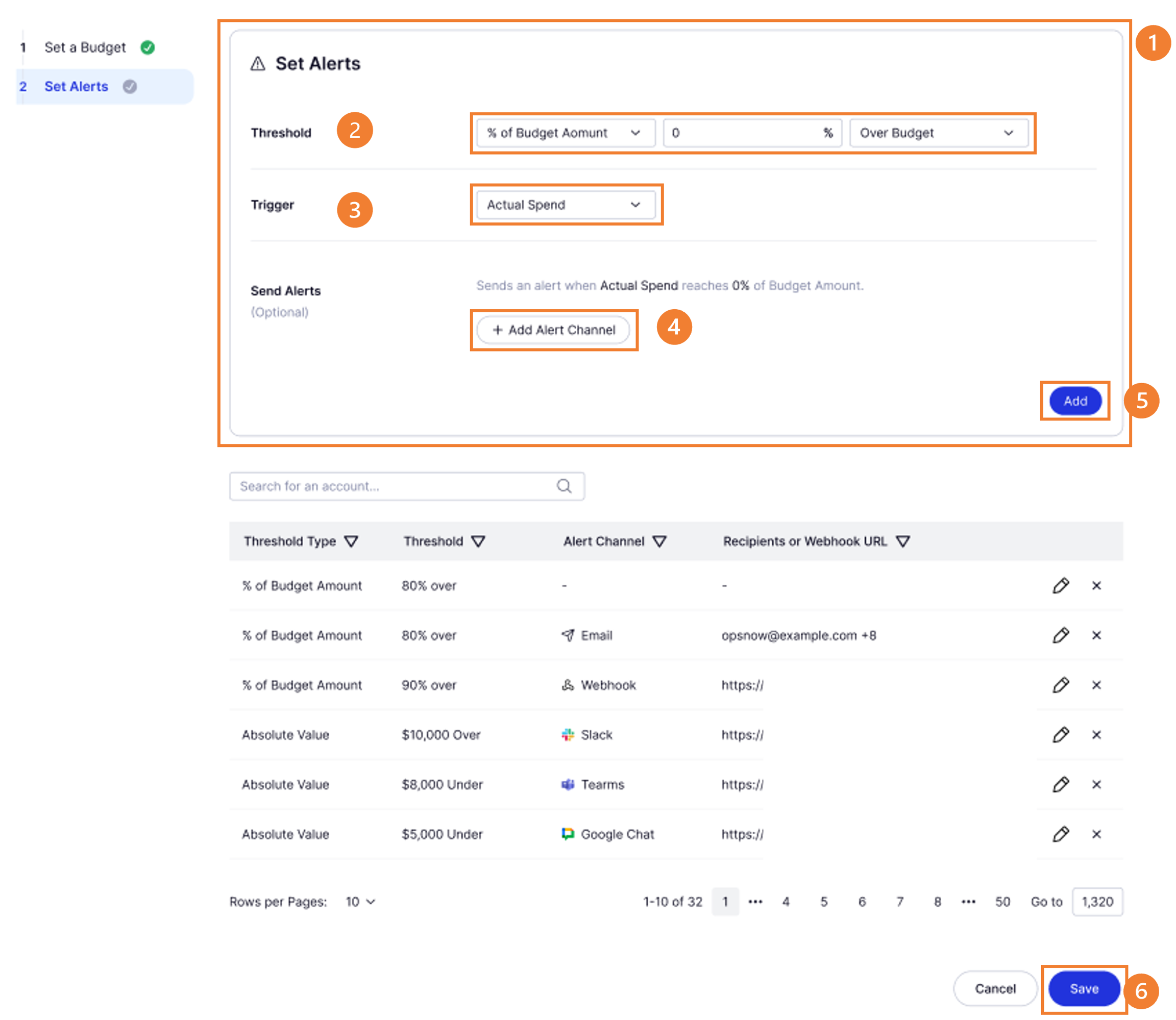 「Set Alerts」 でアラートを設定し、予算を管理できます。設定した予算に対してアラート基準を設定し、さまざまなアラートチャネルを通じて通知を受け取ることができます。