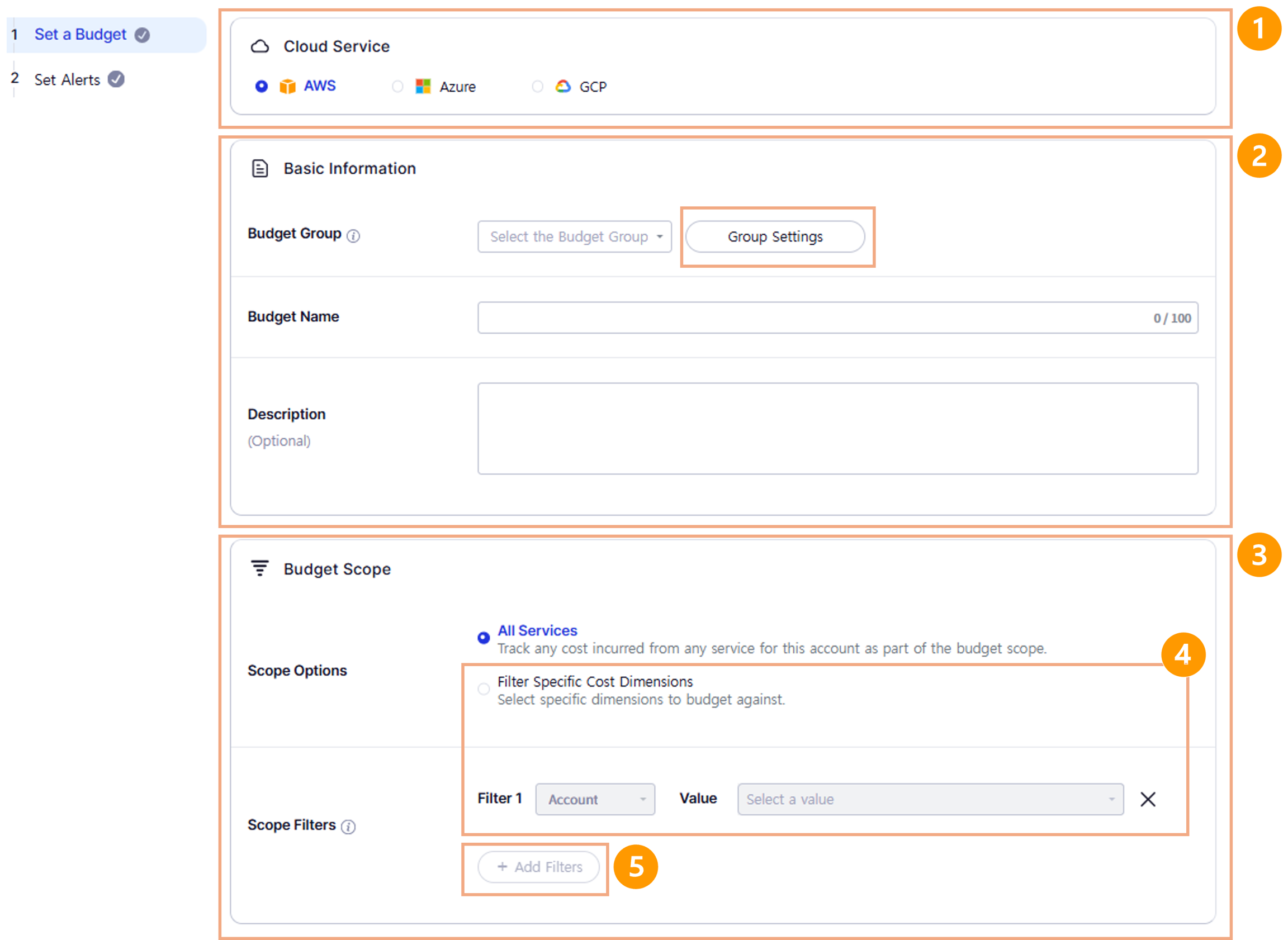 「Set a Budget」 画面では、追加する予算の「Cloud Service」を選択し、「Basic Information」、「Budget Scope」、「Budget Amount」 の各項目に適切な値を設定します。