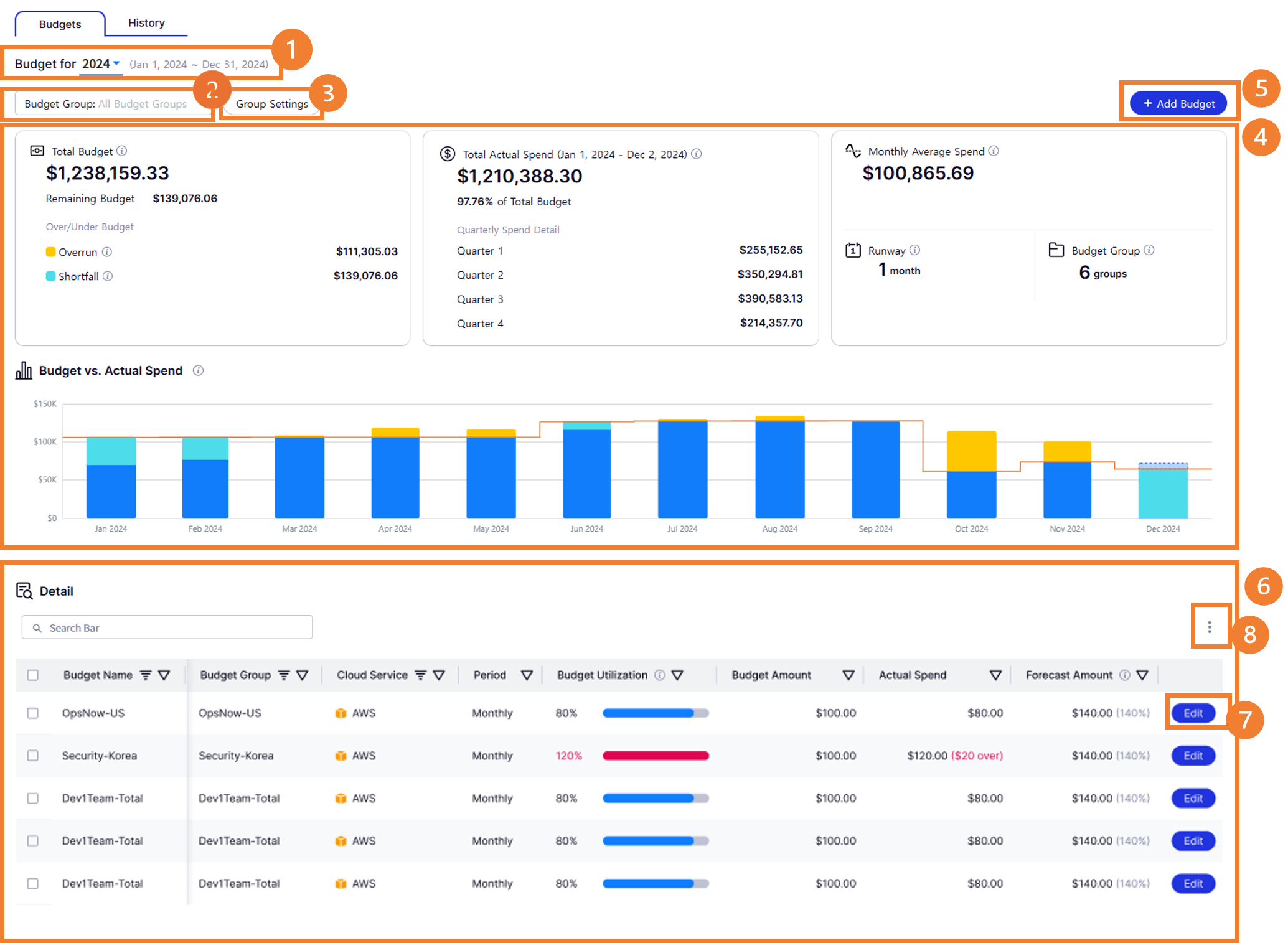 総予算: 設定された予算の合計金額を表示します。また、設定期間を超過した金額(Overrun)や、未使用の金額(Shortfall)も表示されます。