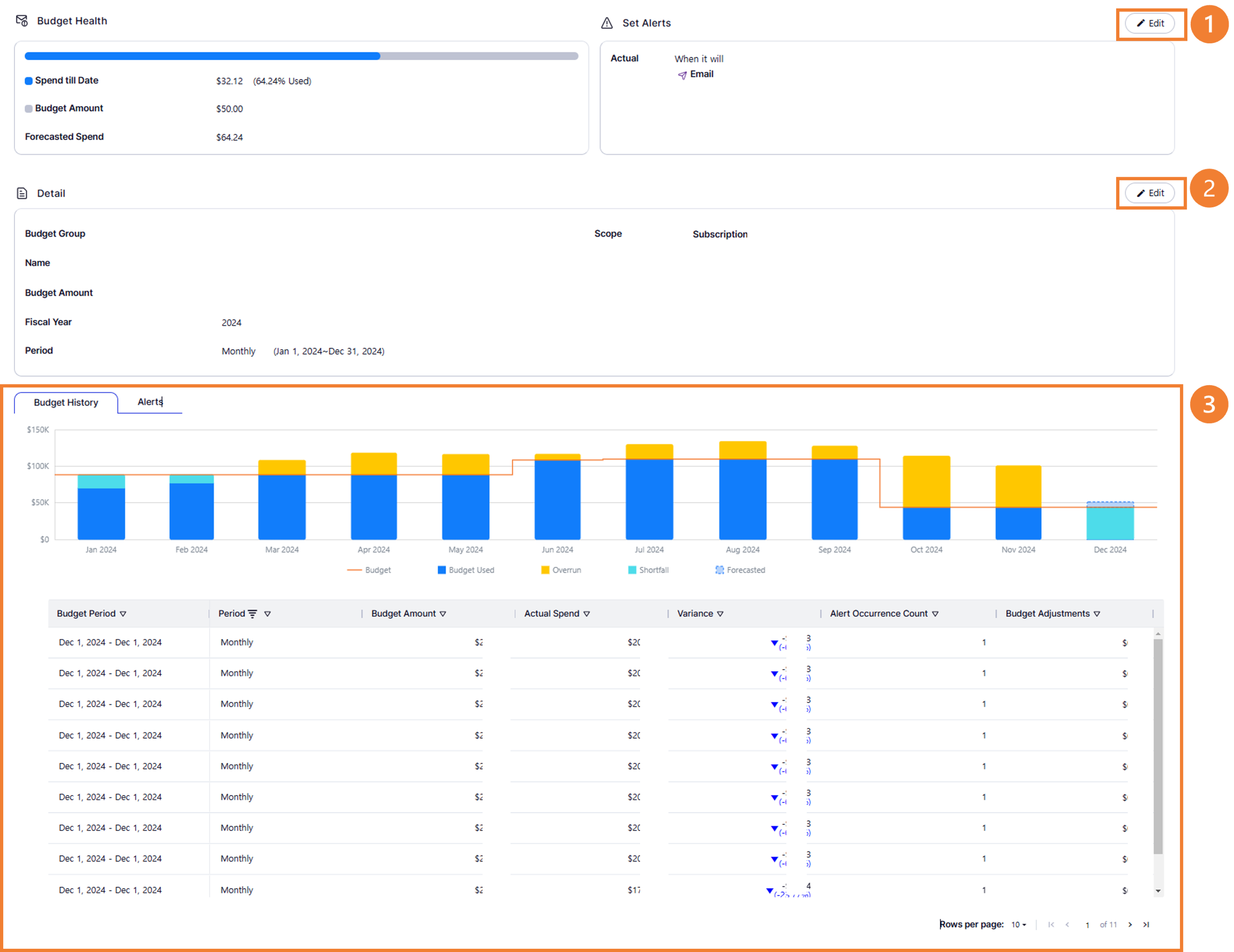 「Budget History」 では、設定された期間内の予算データを確認でき、実際の支出額と予測使用量をグラフで表示 します。グラフの下部には、通知送信の基準に応じた予算使用状況も表示されます。