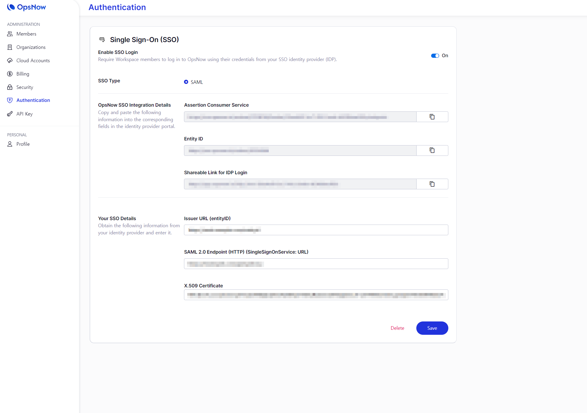 OpsNow SSO Integration Details: SSOを設定するために各項目をコピーし、会社のシステムに入力します。