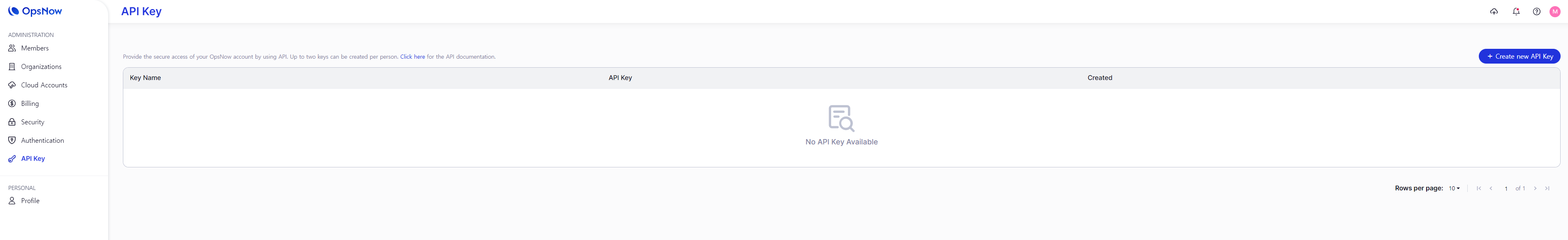 The API Key menu allows you to manage the security access keys used to integrate with OpsNow APIs.