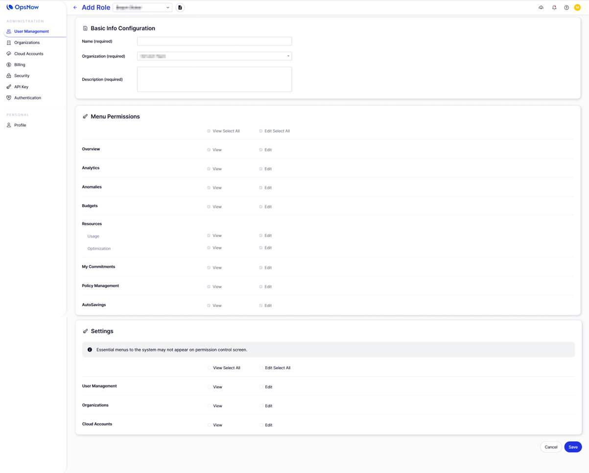 Currently, role permissions are limited to the **Settings** menu. However, OpsNow is actively working on expanding role-based access controls to include menu permissions and more granular controls in the near future. Stay tuned!
