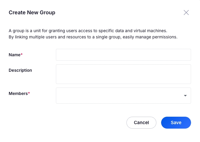 Create a new group to grant access rights to specific data and virtual machines by linking multiple users and resources into a single group.