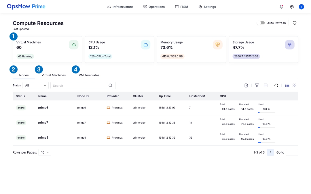 Nodes Status、Node ID、Provider、Cluster、Uptime、割り当てられたCPU、Hosted VM、CPU、Memory、Storageの詳しい現況の情報を提供