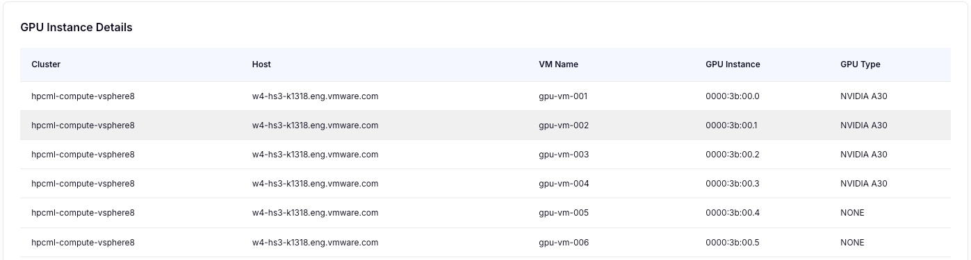 Cluster, Host, VM Name, GPU Instance, GPU type