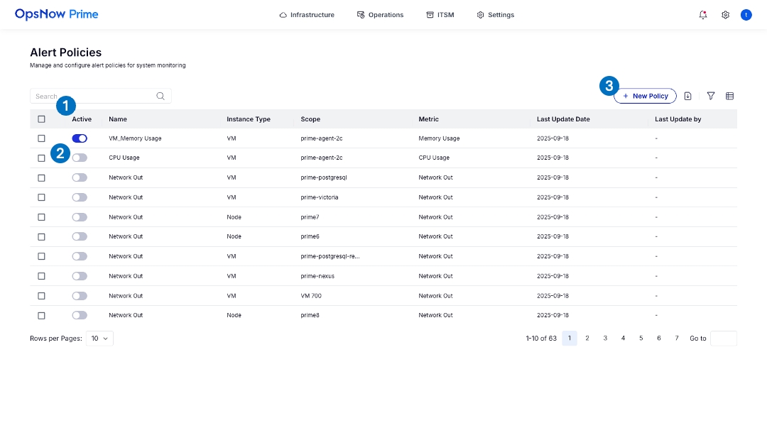 Active Toggle, Alert Name, Instance Type, Scope, Metric, Last Update Date, Last Update by