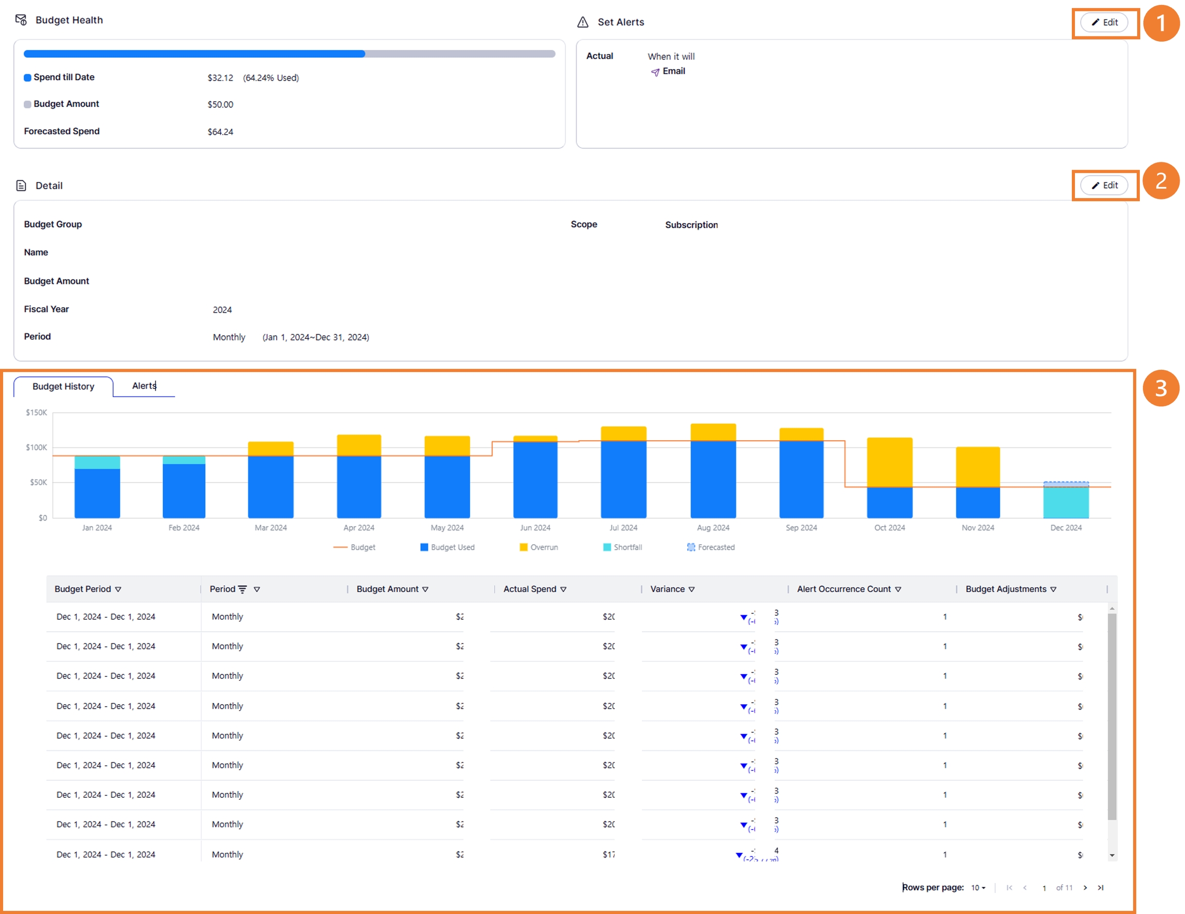 총 예산: 설정된 예산의 총 금액을 표시합니다. 또한 설정 기간을 초과한 금액(Overrun)과 사용하지 않은 금액(Shortfall)도 함께 표시됩니다.