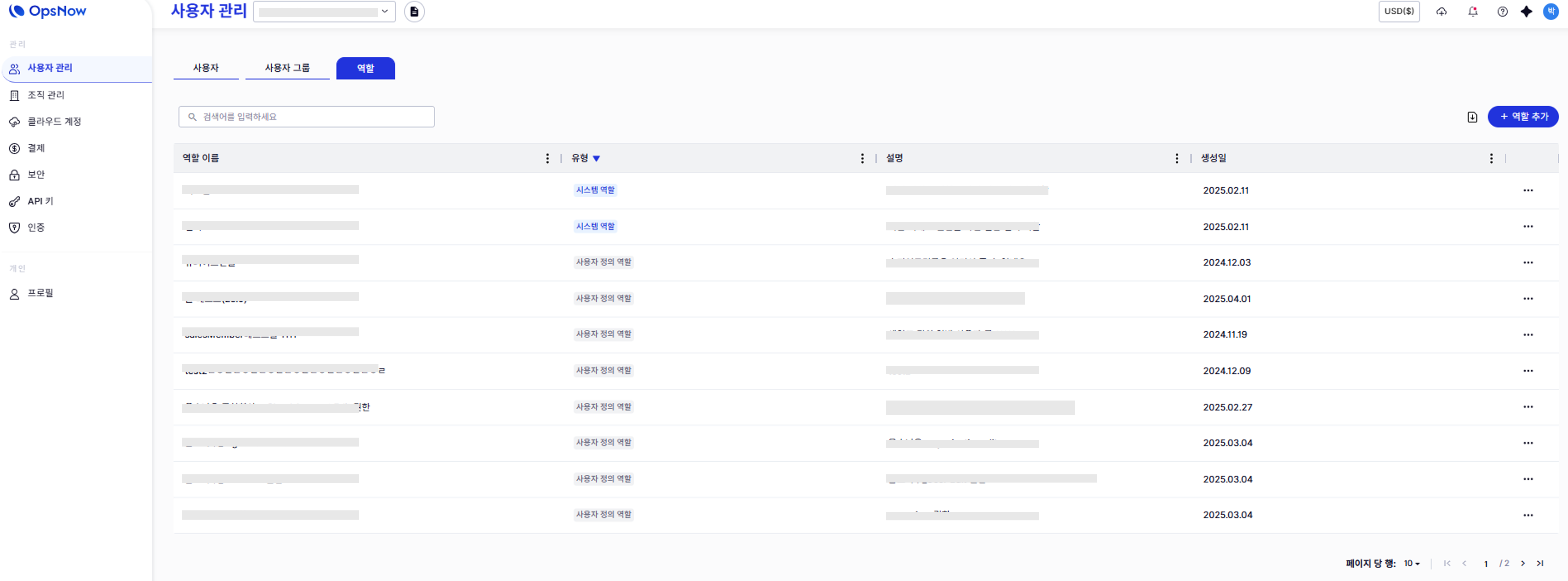 역할(Role)에서는 OpsNow가 제공하는 시스템 역할과, 오너 권한을 가진 사용자가 생성할 수 있는 커스텀 역할을 모두 확인하고 생성할 수 있습니다.