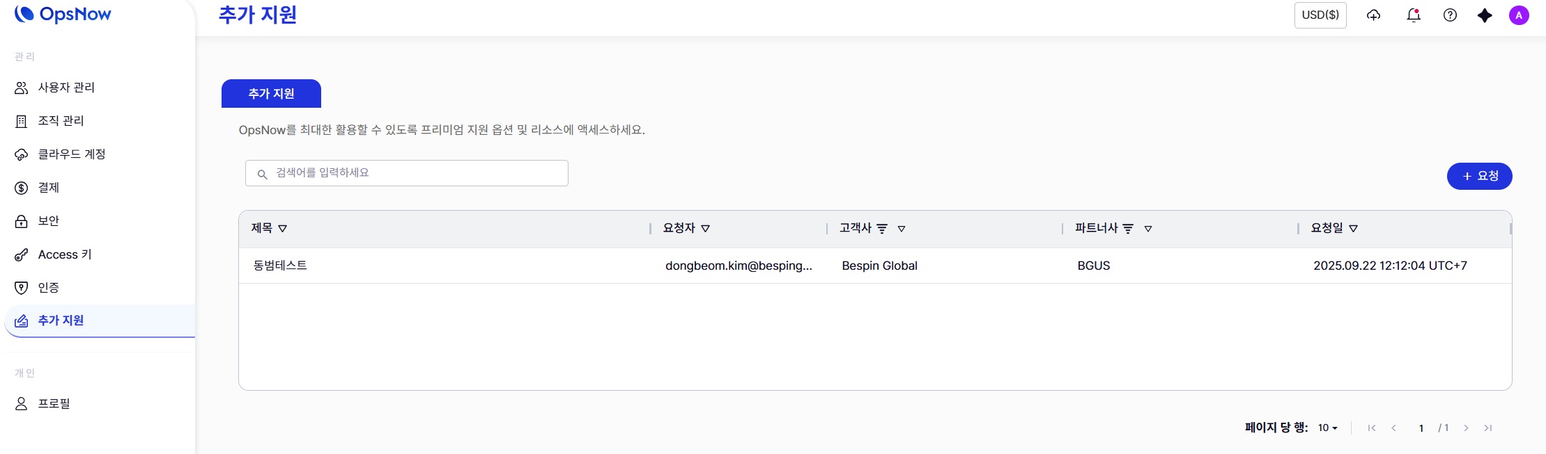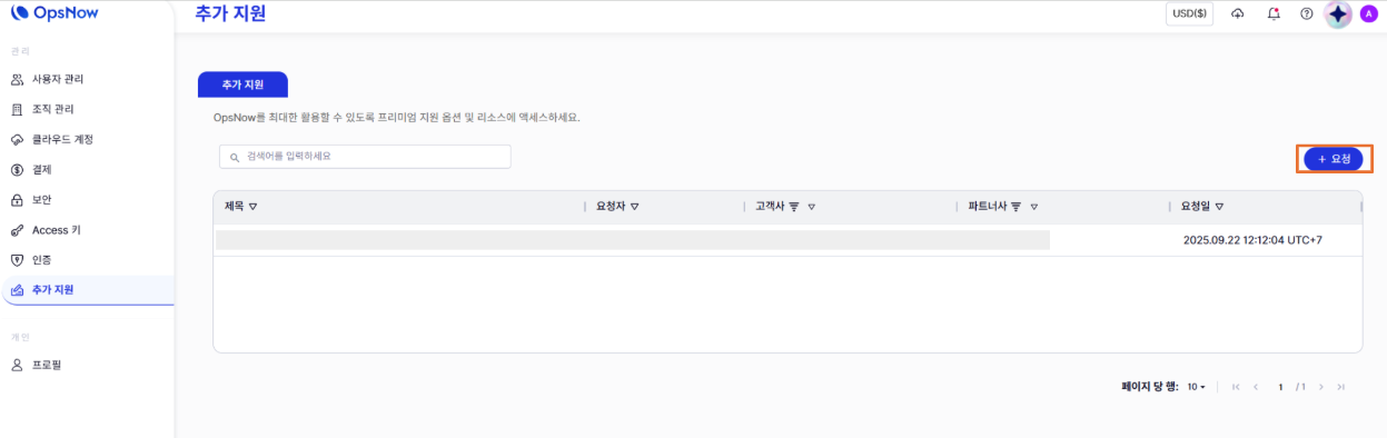 지원팀의 도움을 요청하려면, 화면 오른쪽에 있는 큰 **\[+ 요청]** 버튼을 클릭하십시오.\