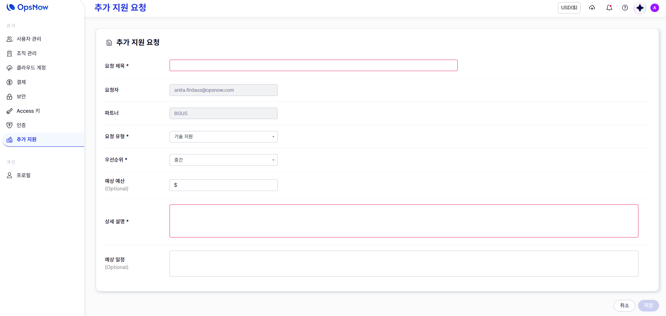 * Request Type: 필요한 지원 유형을 선택합니다.