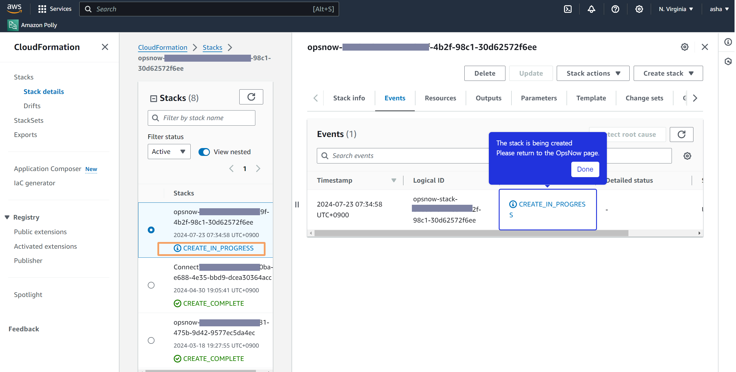 * Click **Create Stack** button below to connect to the AWS console. If a stack is in progress, it will be indicated by a loading icon or an 'in progress' status in OpsNow.
