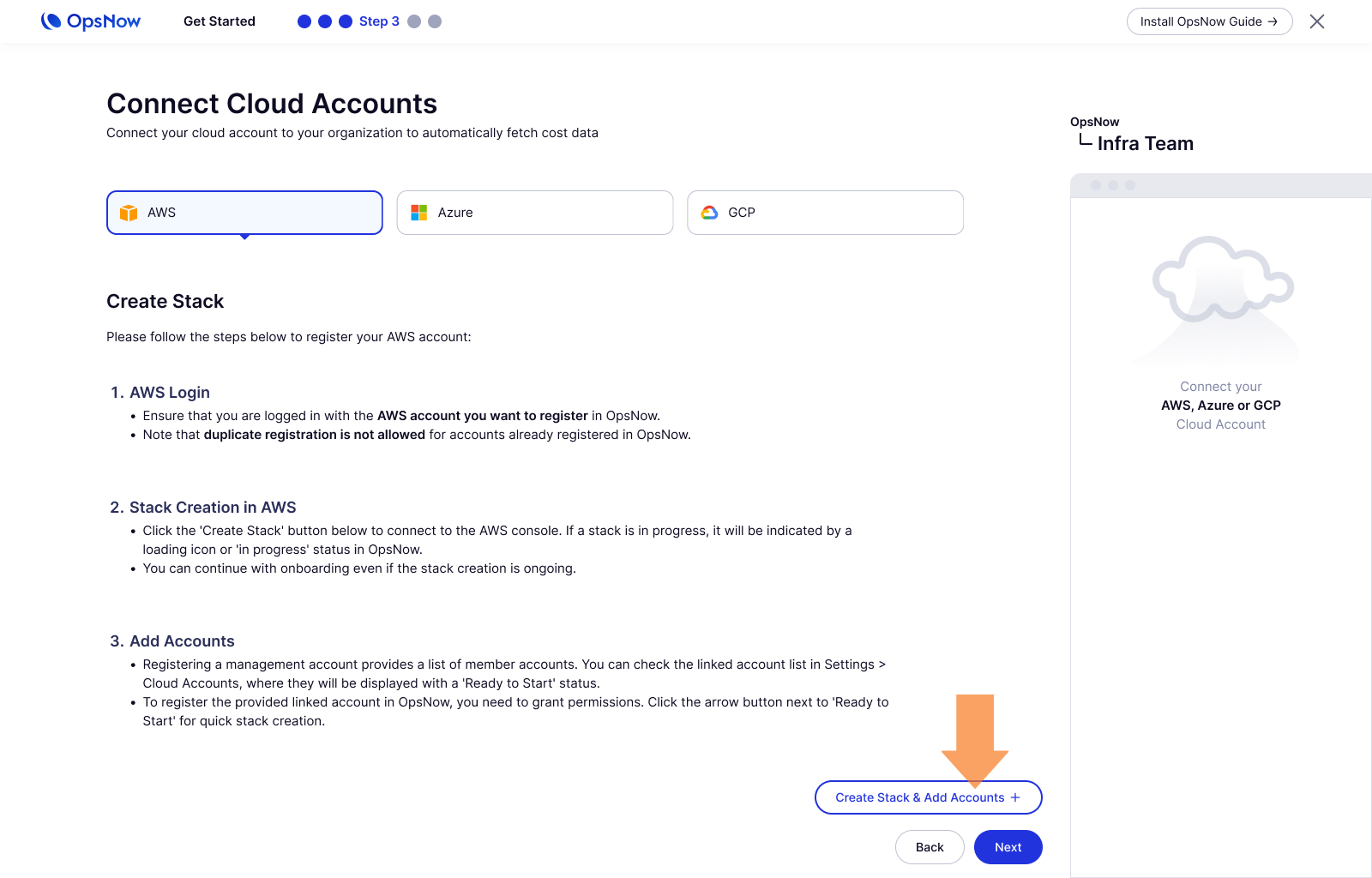* Please check the registered AWS accounts. If there are additional accounts you want to register, simply create another stack.