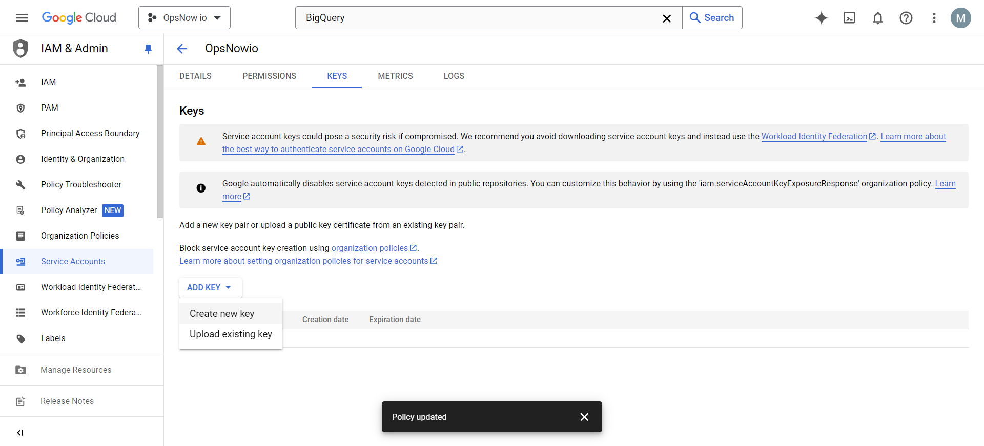 * After creating a new service account, create a Service Key for the service account that you want to integrate with OpsNow. Upload the created Service Key within OpsNow.