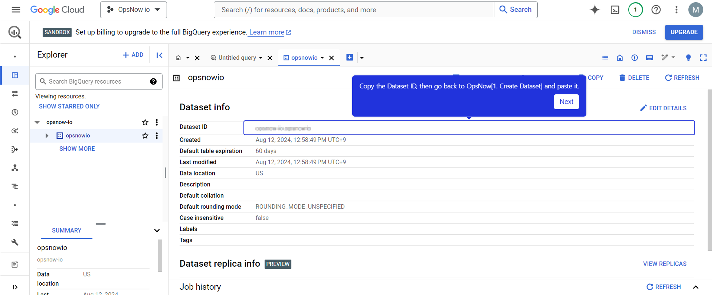 * Create a new **BigQuery Dataset**. Fill in the OpsNow information box with the newly created Dataset ID. Once completed, the button will change to green.
