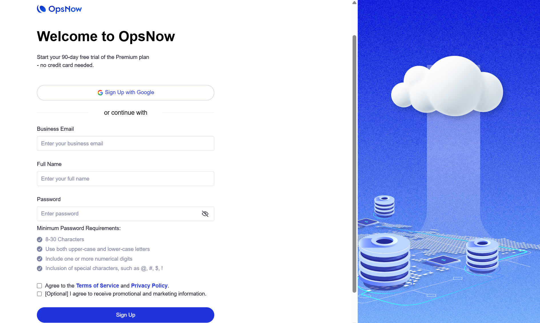 To use OpsNow, you first need to create an account. In addition, most OpsNow services require you to register your cloud account, such as AWS, Azure, or GCP, before you can begin using them.\