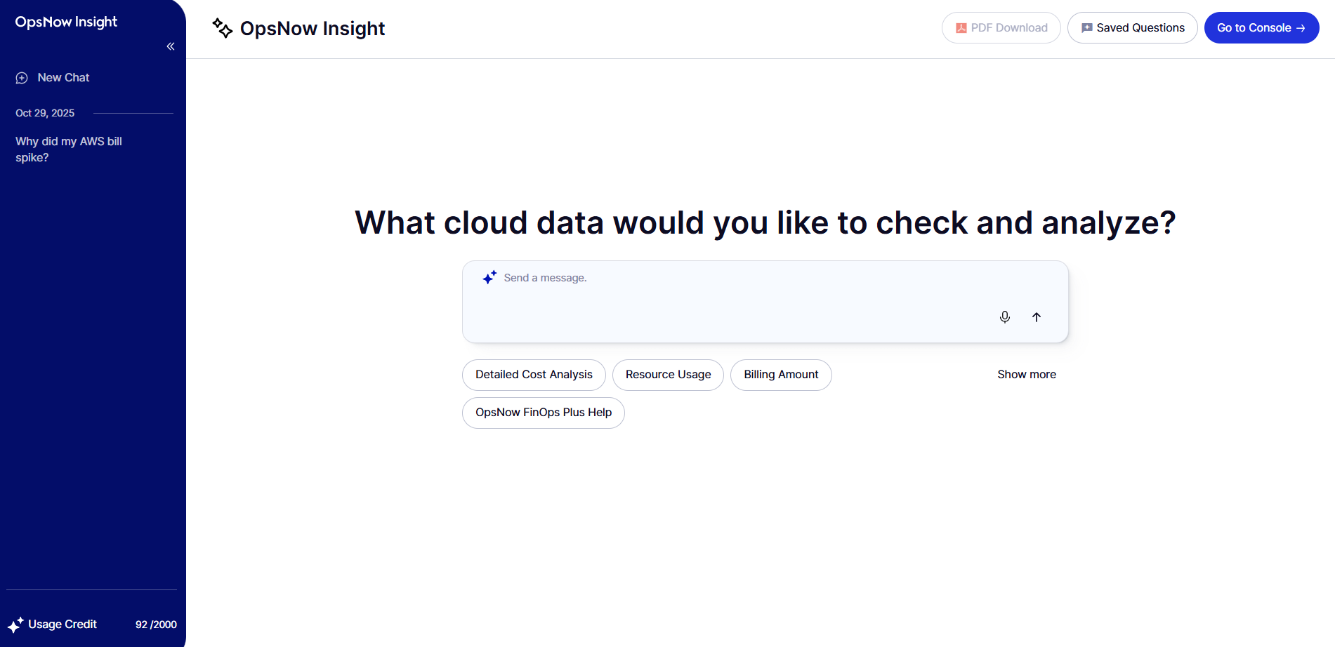 * **Go to Console:** Redirects you to the OpsNow FinOps Plus dashboard.<br>