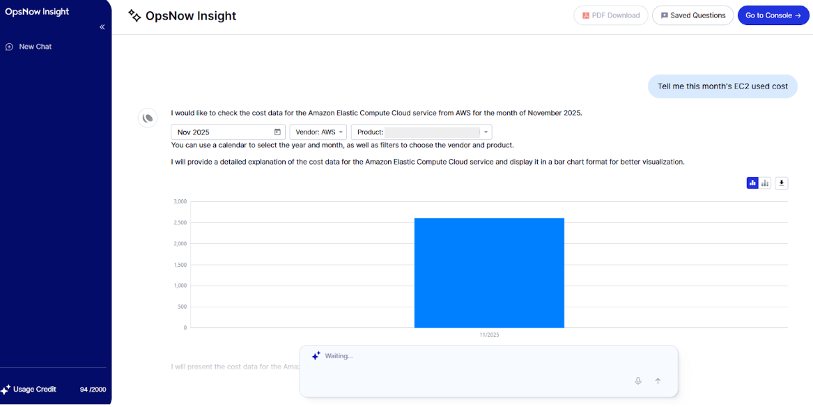 * **Chat Window:** Allows you to enter questions in natural language. Even without knowing technical queries, users can simply type questions in everyday language, and the AI will analyze the cloud data and provide visualized results.