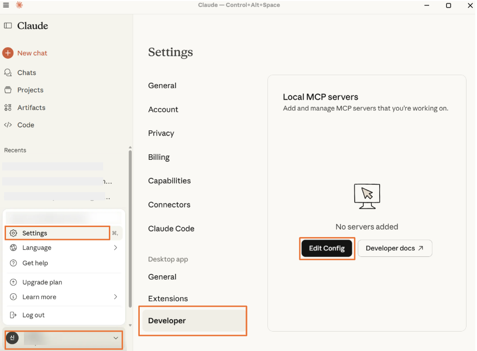 3. After launching Claude Desktop, click \[Settings] from the left menu. Select the \[Developer] tab and click the **\[Edit Config]** button.
