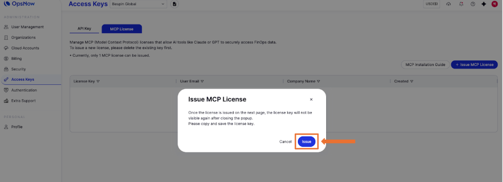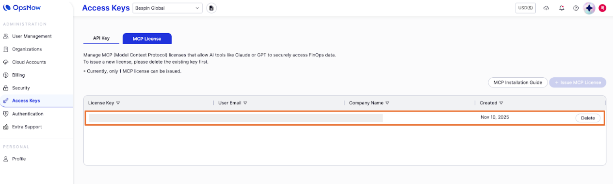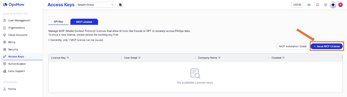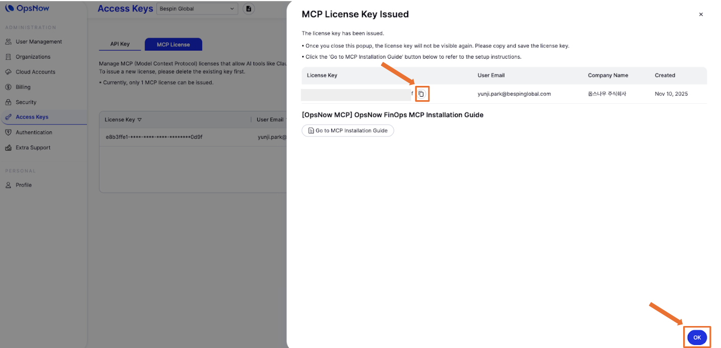 5. In the OpsNow Plus user management page (<https://app.opsnow.io/>), click **'Access Keys'** on the left menu, then click **\[+ Issue MCP License]** to generate your license key.<br>